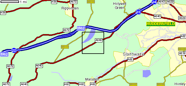 Take first exit for Rochdale, A640 (to the left of large hotel). Follow this road for a further 2 miles and [»] on reaching another roundabout take the third exit (marked Outlane) A640, crossing over motorway.